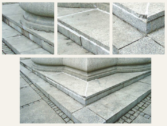 Drugi przykład również z Kołobrzegu. Schody do domu uzdrowiskowego. Zapewne przechodzi po nich mnóstwo ludzi. Więc dlaczego użyto tu stopni okładzinowych zamiast blokowych? Stylistyka obiektu sugeruje, że schody powstały w latach 70., a budowało się wtedy według specyficznych kryteriów. Dlatego za cud uznać można już to, że najniższy stopień jeszcze nie popękał przy tak małej grubości tak dużej płyty. Ktoś jednak próbował te schody remontować. Widać świeże ślady łatania dziur. Tylko jaki sens ma taki remont, skoro nie przyniesie poprawy nawet wizualnej? Brakuje podstopni; zastosowane płyty, podobnie jak w pierwszym przykładzie, nie mają równej grubości czoła i do kompletu dochodzi niestabilność gruntu – płyty klawiszują, a całe schody osiadły poniżej posadzki przed drzwiami. Jakie świadectwo dają te schody kamieniowi, który winien uchodzić za symbol wiekowej trwałości?