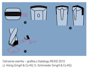 Jeśli zaś ktoś z Was chce ostrzyć wiertła – niech robi to jak najwierniej według rysunku na sąsiedniej stronie. Dzięki temu otwór będzie okrągły, a wiercenie przebiegnie sprawnie i bez uszkadzania materiału i narzędzia. Polecam zwłaszcza wiertła o widii trójramiennej, bo łatwo ją naostrzyć, dobrze i szybko wierci nawet twardy granit. Wiertła (i katalog z przydatnymi rysunkami) mam od firmy Widuto.
