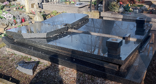 Po ostatnich nawałnicach zobaczyłem kilka ciekawych okazów. Dwa zasługują na komentarz publiczny. Nagrobek powstał dobrych kilka lat temu. W części napisowej dwie grube, duże płyty z popularnej Impali runęły na płyty nakrywowe, doprowadzając do ich połamania (zdjęcia obok). Na zdjęciach również widzimy, iż kamienie były sklejone ze sobą punktowo. Do montażu nie użyto żadnego zakotwienia. Zaoszczędzono przy montażu 20 zł na wywiercenie gniazd i wklejenie kotew. Straty wyniosły kilkadziesiąt tysięcy złotych.