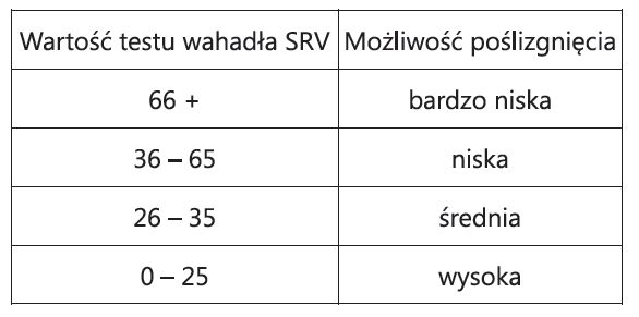 Powierzchnie o nierówności powierzchni mierzonej wg EN 13373 p. 5.3. większej niż 1,0 mm uznaje się za bezpieczne i nie ma potrzeby badania wartości SRV. Znając wartość SRV można ocenić poziom bezpieczeństwa nawierzchni wykonanej z danego materiału i o danym rodzaju wykończenia powierzchni. Można również ocenić jak zmienia się śliskość mokrej powierzchni, porównując wyniki badań wykonanych na suchej i mokrej próbce.