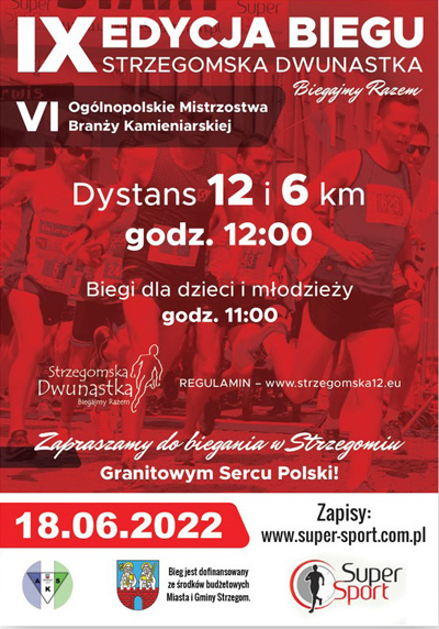 Po dwuletniej przerwie i dwóch edycjach wirtualnych wracamy na trasę Strzegomskiej Dwunastki! Widzimy się w Strzegomiu 18 czerwca 2022 r. podczas IX edycji Biegu, VI Ogólnopolskich Mistrzostw Branży Kamieniarskiej oraz Święta Granitu Strzegomskiego!