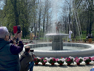 Elementy: Płyty wokół fontanny płomieniowane, wewnątrz szlif C120, pozostałe elementy groszkowane.
