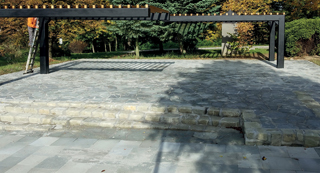 Elementy: płomieniowane płyty z piaskowca – regularne o różnych wymiarach i nieregularna „dzikówka”, grub. 10 cm. Ilość: ponad 400 m2 na ścieżki.