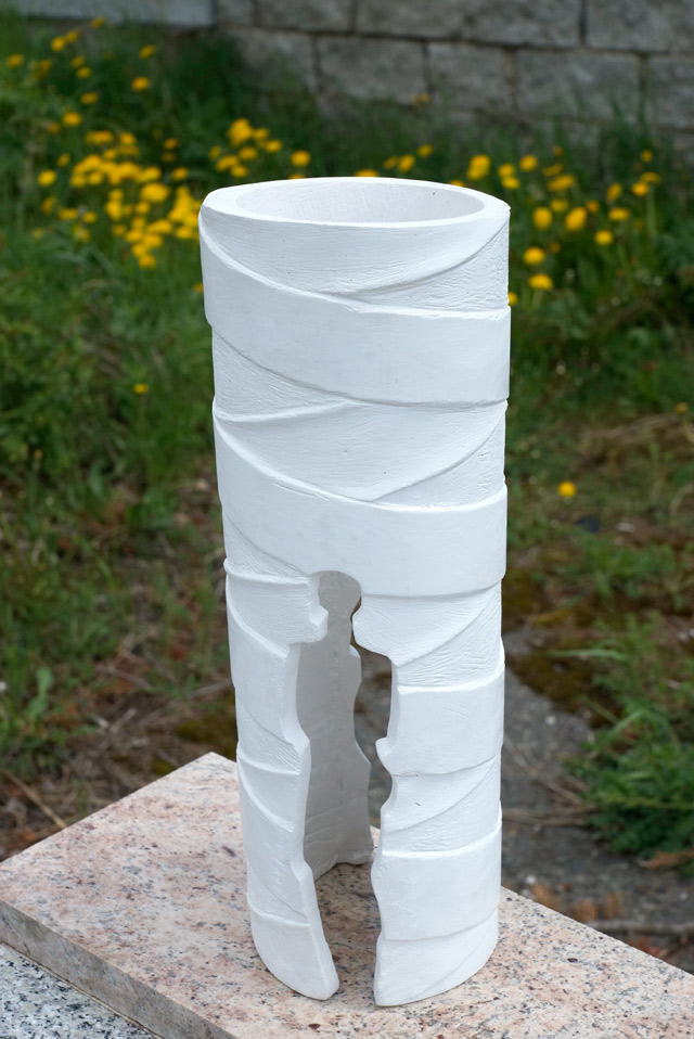 Rzeźba będzie wydrążonym walcem o wysokości 3 m i średnicy 1,2 m. Dookoła rzeźby będą biegły pasy symbolizujące ludzkie DNA, a z obu stron będą wycięte sylwetki – z jednej strony mężczyzny, z drugiej kobiety. Materiał – impala – dostarcza Kamieniarstwo Zenon Kiszkiel, który też realizuje wstępną obróbkę oraz przewiercenie przez blok osiowo otworu pozwalającego wprowadzić linkę diamentową do cięcia profilowego. Następną część zadania realizuje Granex – czyli wycięcie kamiennej „rury”. Jak nam powiedział Krzysztof Skolak: „Najwięcej problemów może przyspożyć wyciągnięcie wyciętego rdzenia. Ścianki walca będą miały tylko 10 cm, a wycięta część będzie miała swoją wagę”. Granex wytnie też sylwetkę kobiety – ze względów technologicznych będzie ona po obu stronach. Jedną z sylwetek na mężczyznę zamieni Jan Krzeszowiec, który zajmie się pracami wykończeniowymi rzeźby. Obróbka wykończeniowa nada również różnym fragmentom rzeźby różne faktury: szlifowaną, groszkowaną i polerowaną.