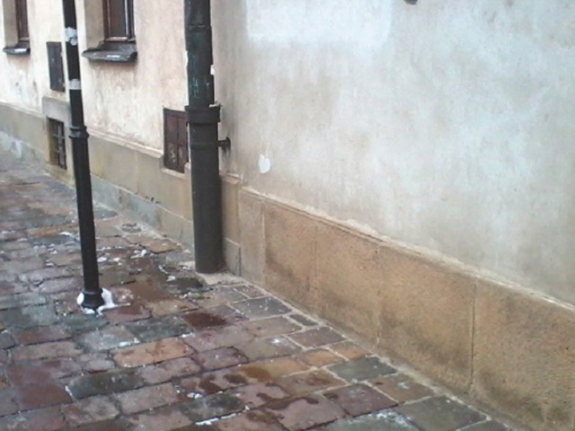 Bohaterami dzisiejszej opowieści są kamieniczki, które sąsiadują ze sobą – na zdjęciu widać, że graniczą „przez rynnę”. Przechodziły remont mniej więcej w tym samy czasie. Stoją przy tym samym chodniku – nota bene miło, że wyłożonym porfirem, a nie kostką betonową. Zatem warunki użytkowania są dla nich jednakowe: jednakowe narażenie na erozyjne działanie sił natury, jednakowe oddziaływanie zabiegów porządkowych człowieka – także tych zimowych z użyciem soli. A jakże różny efekt już po kilku latach użytkowania.