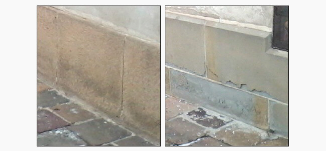 W obu przypadkach zastosowano cokoły z piaskowca. W pierwszym przypadku posłużą przez długie lata. Wprawdzie cokoły ciągną wodę z podłoża i pojawiają się przebarwienia, bo wykonawca nie zastosował warstwy odcinającej między chodnikiem a ścianą. Ale materiał tak dobrano, że wytrzyma przysłowiowe sto lat. W drugim przypadku cokoły nadają się już do wymiany – złuszczone, pokruszone, obsypujące się.