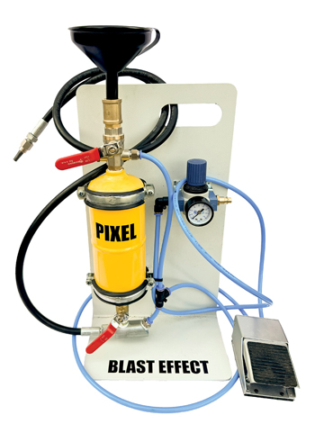 Blast Effect Pixel to kompaktowa, ciśnieniowa maszyna do piaskowania za rozsądne pieniądze. Inwestycja zwróci się już po kilku wykonanych portretach. Oprócz atrakcyjnej ceny cechuje się przemyślną konstrukcją. Do obsługi piaskarki używa się pedału nożnego, by operator zawsze miał wolne obie ręce. Zastosowana dysza wykonana jest z węgliku wolframu, więc jest bardzo twarda i przez to odporna na zużycie w kontakcie ze ścierniwem. Dysza ma średnicę 2,5 mm, co pozwala na bardzo precyzyjne kierowanie strumienia ścierniwa w określone miejsca grafiki. Sama dysza jest zamontowana w uchwycie przypominającym długopis – daje komfort użytkowania poprzez naturalne ułożenie dłoni.