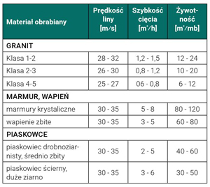 • odpowiednie parametry pracy maszyny (patrz tabela poniżej) – podane parametry pracy należy traktować jako zalecane, w szczególnych przypadkach można je w pewnym zakresie modyfikować w zależności od ciętego kamienia;